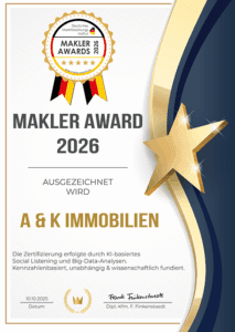 Der „Makler Award“ ist ein hochwertiges Qualitätssiegel, das ausschließlich an Makler verliehen wird, die in allen Bereichen herausragende Leistungen erbringen. Es steht für höchste Standards. Dieses Siegel symbolisiert nicht nur eine Auszeichnung, sondern auch das Vertrauen der Kunden in ein außergewöhnliches Erlebnis.